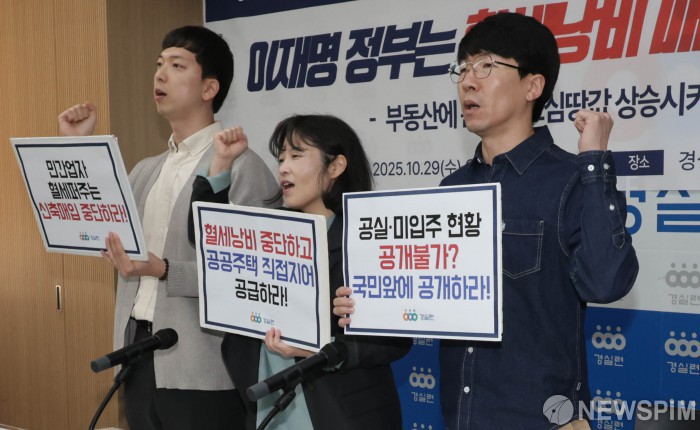 [서울=뉴스핌] 양윤모 기자 = 경실련이 29일 오전 서울 종로구 경실련 강당에서 'SH·GH·LH 매입임대주택 실태 분석결과 발표' 기자회견을 진행했다. 행사에는 이주현 경실련 부동산국책사업팀 간사,조정흔 경실련 토지주택위원장(감정평가사),정택수 경실련 부동산국책사업팀 부장이 참석했다. 2025.10.29 yym58@newspim.com
