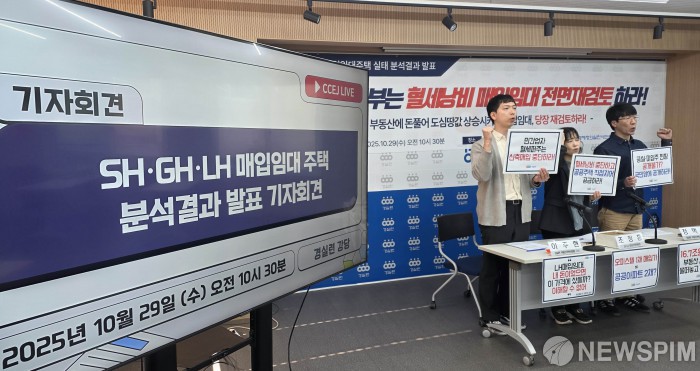 [서울=뉴스핌] 양윤모 기자 = 경실련이 29일 오전 서울 종로구 경실련 강당에서 'SH·GH·LH 매입임대주택 실태 분석결과 발표' 기자회견을 진행했다. 행사에는 이주현 경실련 부동산국책사업팀 간사,조정흔 경실련 토지주택위원장(감정평가사),정택수 경실련 부동산국책사업팀 부장이 참석했다. 2025.10.29 yym58@newspim.com