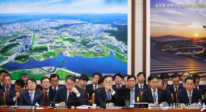 [서울=뉴스핌] 김학선 기자 = 김윤덕 국토교통부 장관(앞줄 가운데)이 29일 서울 여의도 국회 국토교통위원회에서 열린 국토교통부 등에 대한 종합감사에서 이상경 전 국토부 1차관의 고가 아파트 매입과 갭투자(전세 낀 주택 구입) 논란과 관련한 질의를 듣고 있다. 2025.10.29 yooksa@newspim.com
