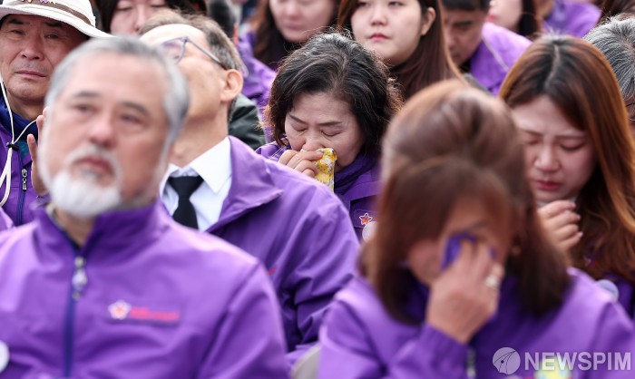 [서울=뉴스핌] 이길동 기자 = 29일 서울 종로구 광화문광장에서 열린 10.29 이태원 참사 3주기 기억식에서 유가족들이 슬픔에 잠겨 있다. 2025.10.29 gdlee@newspim.com