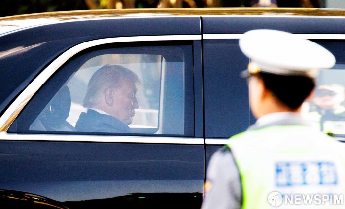 [경주=뉴스핌] 윤창빈 기자 = 도널드 트럼프 미국 대통령이 29일 경북 경주시 국립경주박물관에서 열린 한미정상회담에 참석하기 위해 전용 리무진인 '더 비스트'를 탑승하고 이동하고 있다. 2025.10.29 pangbin@newspim.com