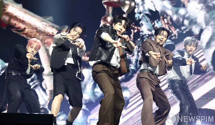 [서울=뉴스핌] 최지환 기자 = 그룹 위아이(WEi) 멤버들이 29일 오후 서울 광진구 예스24라이브홀에서 열린 미니8집 'Wonderland' 발매 기념 미디어 쇼케이스에서 타이틀곡 'DOMINO' 무대를 선보이고 있다. 위아이의 이번 미니앨범은 함께하면 근심도, 걱정도 없이 함께라 즐겁고 행복한 마음을 원더랜드에 빗댄 메시지를 5개 트랙에 담아냈다. 2025.10.29 choipix16@newspim.com