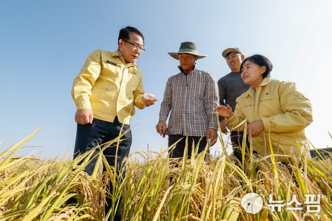 정 시장은 안성환 우리밀영농조합법인 대표 농가 포장을 찾아 피해 벼 상태를 직접 확인하고, 농가의 어려움을 청취했다. 현장에는 가루미 품종 재배 농가와 관계 공무원 등 10여 명이 함께했다.