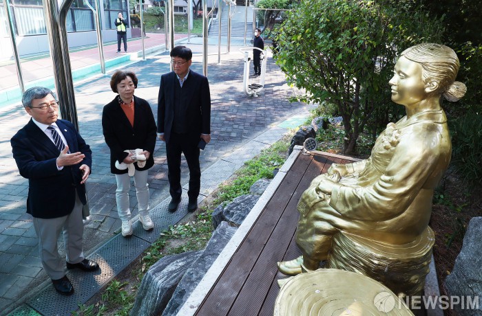 [서울=뉴스핌] 양윤모 기자= 정근식 서울시교육감이 29일 오후 서울 A고등학교 내 '평화의 소녀상'을 방문하고 있다. 이날 위안부법폐지국민행동 등 우익단체는 평화의 소녀상이 설치된 학교 앞에서 철거를 요구하는 집회를 예고했으나 실제 이뤄지진 않았다.2025.10.29 yym58@newspim.com