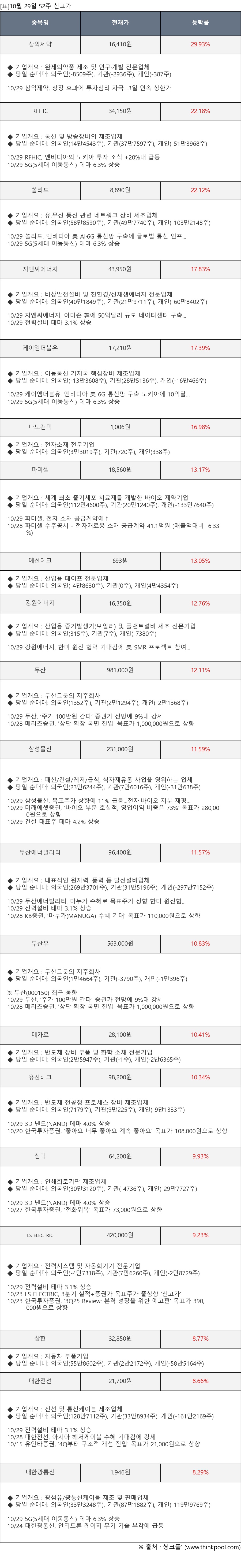 ※ 관련 종목: 삼익제약, RFHIC, 쏠리드, 지엔씨에너지, 케이엠더블유, 나노캠텍, 파미셀, 예선테크, 강원에너지, 두산, 삼성물산, 두산에너빌리티, 두산우, 메카로, 유진테크, 심텍, LS ELECTRIC, 삼현, 대한전선, 대한광통신