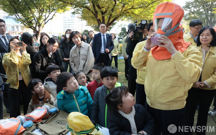[서울=뉴스핌] 이길동 기자 =김민석 국무총리가 29일 오후 서울 종로구 정부서울청사 잔디마당서 열린 화재 대비 민방위 훈련에서 방독면을 착용해 보고 있다. 2025.10.29 gdlee@newspim.com