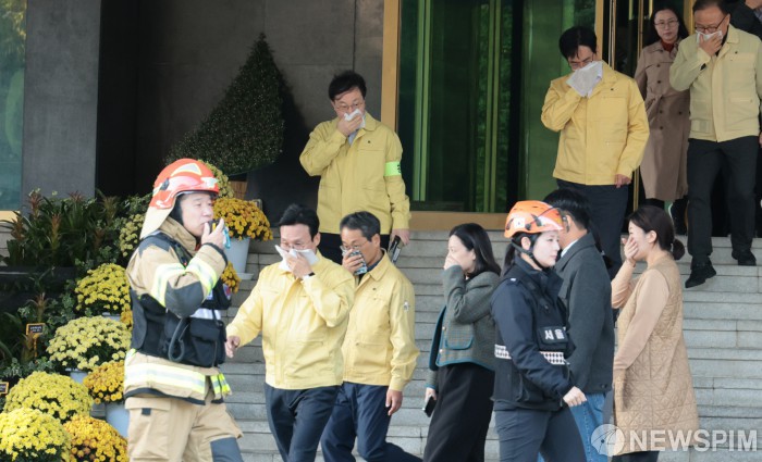 [서울=뉴스핌] 이길동 기자 =김민석 국무총리가 29일 오후 서울 종로구 정부서울청사 열린 화재 대비 민방위 훈련에 직원들과 참가 하고 있다.2025.10.29 gdlee@newspim.com