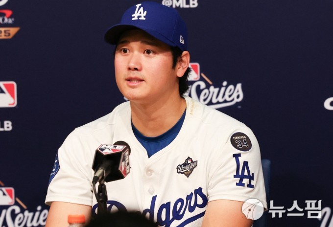 | [로스앤젤레스=뉴스핌] 박상욱 기자= 오타니가 29일(한국시간) 2025 MLB 월드시리즈 4차전을 마치고 기자회견에서 취재진 질문에 답하고 있다. 2025.10.29 psoq1337@newspim.com |