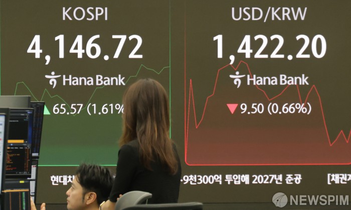 [서울=뉴스핌] 양윤모 기자 = 경주 APEC에서 한·미 관세협상이 타결된 가운데, 30일 오전 코스피가 전장 종가보다 65.57 포인트(1.61%) 상승하며 4146.72로, 코스닥은 0.73 포인트(0.08%) 하락한 900.86으로 장을 시작한 가운데, 서울 중구 하나은행 딜링룸에서 직원들이 업무를 보고 있다. 서울외환시장에서 달러/원 환율은 전장 대비 9.50원 하락한 1422.20원에 거래를 시작했다. 2025.10.30 yym58@newspim.com