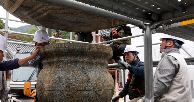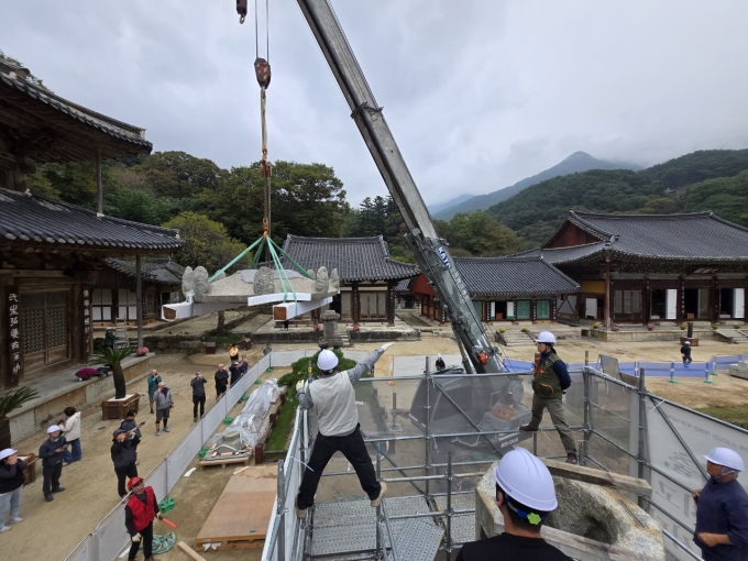 | [서울=뉴스핌] 최문선 기자 = 구례 화엄사 각황전 앞 석등 복원 과정. [사진=국가유산청] 2025.10.30 moonddo00@newspim.com |
