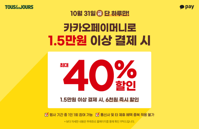 이번 행사는 오는 31일 오전 9시부터 진행되며 뚜레쥬르 오프라인 매장에서 카카오페이머니로 결제 시 최대 40% (최대 6000원)을 즉시 할인해 준다. 1인 1회 참여 가능하며, 타 제휴 프로모션과의 중복 할인이나 적립, MMS 사용은 불가하다. 자세한 사항은 카카오페이앱 또는 카카오톡 내 카카오페이홈의 결제탭에서 확인할 수 있다.