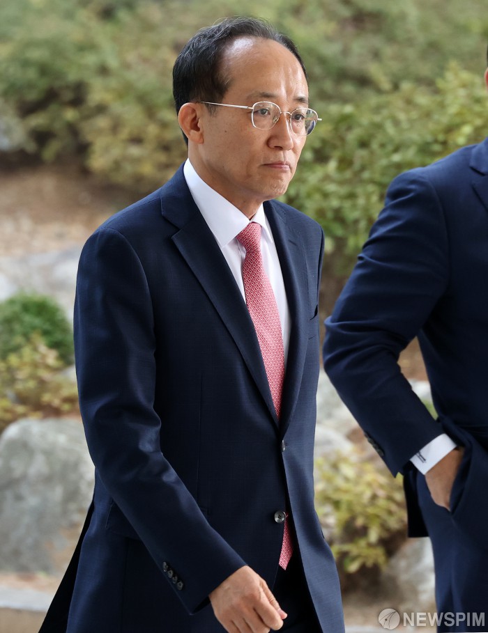 [서울=뉴스핌] 최지환 기자 = 국회의 계엄해제 의결을 방해한 의혹을 받는 추경호 전 국민의힘 원내대표가 30일 오전 서울 서초구 서울고등검찰청에 마련된 내란 특검팀 사무실에 피의자 신분으로 출석하고 있다. 2025.10.30 choipix16@newspim.com
