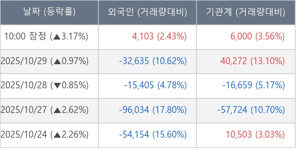 [서울=뉴스핌] 로보뉴스 = 30일 10시 15분 현재 한국금융지주(071050)는 외국인과 기관이 각각 0.41 만 주, 0.60 만 주 순매수(잠정) 하면서 전일 대비 3.17% (현재가 182,300원) 상승하고 있다.