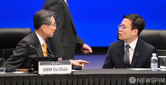 [서울=뉴스핌] 청사사진기자단 =조현(왼쪽) 외교부 장관과 여한구 통상교섭본부장이 30일 오전 경북 경주시 소노캄 경주 그랜드볼룸에서 열린 2025 APEC 외교통상합동각료회의 개회식에서 대화를 나누고 있다.2025.10.30 photo@newspim.com