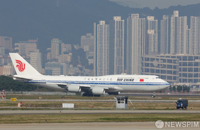 [서울=뉴스핌] 시진핑 중국 국가주석이 탑승한 전용기가 30일 김해공항에 착륙하고 있다. 이날 시 주석은 도널드 트럼프 미국 대통령과 정상회담을 진행한다. [사진=APEC 2025 KOREA & 연합뉴스] 2025.10.30 photo@newspim.com