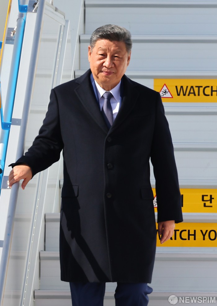 [서울=뉴스핌] 시진핑 중국 국가주석이 30일 김해공항에 도착하고 있다. 이날 시 주석은 도널드 트럼프 미국 대통령과 정상회담을 진행한다. [사진=APEC 2025 KOREA & 연합뉴스] 2025.10.30 photo@newspim.com