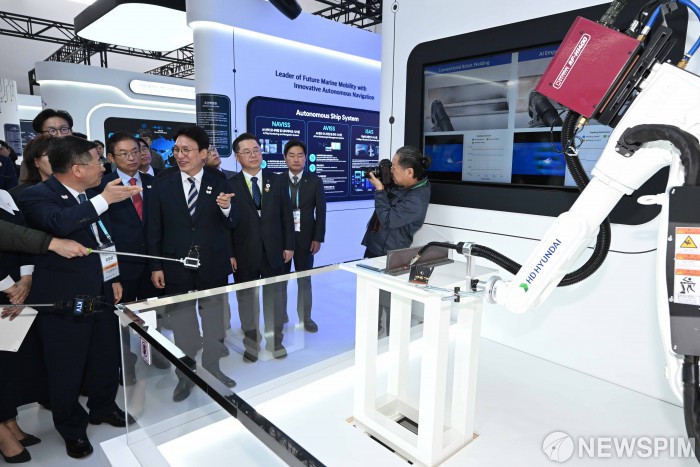 [경주=뉴스핌] 윤창빈 기자 = 김민석 국무총리가 30일 경북 경주 엑스포 대공원에서 열린 APEC 경제전시장에 방문해 인공지능 용접 로봇에 대해 설명을 듣고 있다. 2025.10.30 pangbin@newspim.com