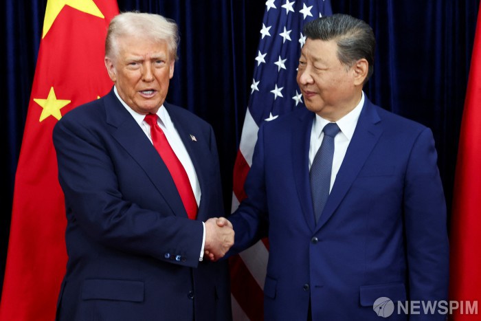 [부산 로이터=뉴스핌] 도널드 트럼프 미국 대통령과 시진핑 중국 국가주석이 30일 부산 김해국제공항 나래마루에서 정상회담을 앞두고 악수를 하고 있다. 2025.10.30 photo@newspim.com