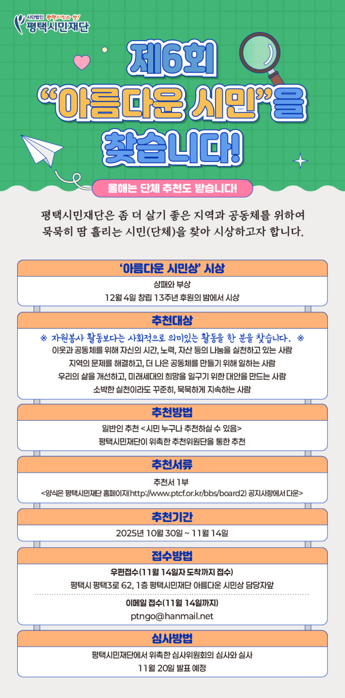 | 평택시민재단, '제6회 아름다운 시민상' 수상자 모집 안내 홍보물[사진=재단] |