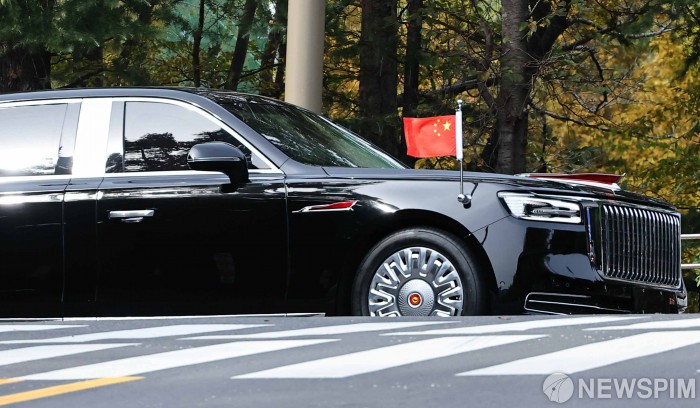 [경주=뉴스핌] 윤창빈 기자 = 시진핑 중국 국가주석이 탑승한 훙치 N701이 30일 오후 경북 경주시 코오롱호텔로 들어가고 있다. 2025.10.30 pangbin@newspim.com