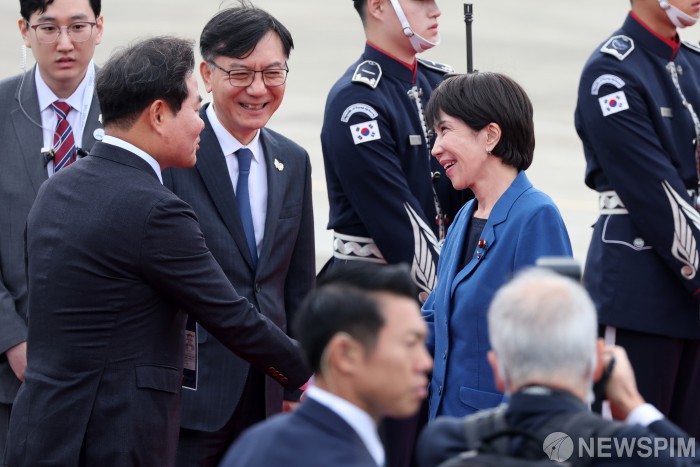 [서울=뉴스핌] 경주 APEC 정상회의 참석을 위해 방한한 다카이치 사나에 일본 총리가 30일 부산 김해국제공항에 도착해 전용기에서 내려 한국 측 인사와 인사하고 있다. [사진=APEC 2025 KOREA & 연합뉴스] 2025.10.30 photo@newspim.com