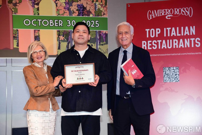[서울=뉴스핌] 양윤모 기자 = 30일 서울 중구 앰배서더 서울 풀만 호텔에서 개최된 ‘감베로 로쏘 – 2025 TOP 이탈리안 와인 로드쇼’에서 감베로 로쏘가 선정한 ‘TOP 이탈리안 레스토랑 2026’ 발표 및 시상식이 개최된 가운데, 피자 3개를 수상한 마리오네(Pizzeria Marione)가 기념촬영을 하고 있다. 왼쪽부터 에밀리아 가토 주한 이탈리아 대사, 김주영 마리오네 대표, 감베로 로쏘의 루이지 살레르노 CEO [사진=와인21] 2025.10.30 yym58