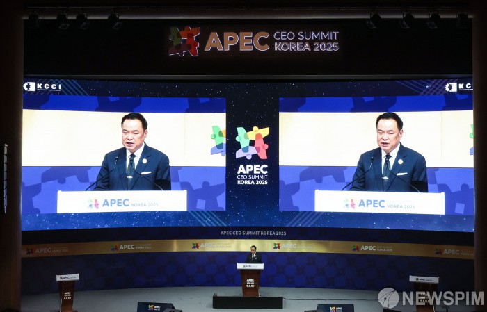 [서울=뉴스핌] 아누틴 찬위라꾼 태국 총리가 30일 오후 경북 경주시 경주예술의전당에서 열린 아시아태평양경제협력체(APEC) 정상회의 최고경영자(CEO) 써밋 특별세션에서 연설을 하고 있다. [사진=APEC 2025 KOREA & 연합뉴스] 2025.10.30 photo@newspim.com