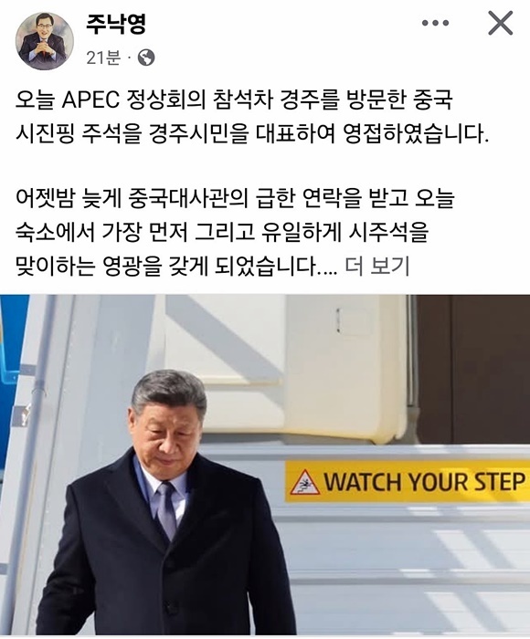 | 주낙영 경주시장이 시진핑 중국 국가주석을 공식 영접한 사실을 자신의 페이스북을 통해 전했다.[사진=주낙영 경주시장 페이스북]2025.10.30 nulcheon@newspim.com |