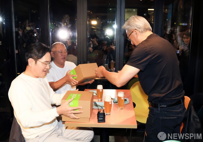 [서울=뉴스핌] 최지환 기자 = 젠슨 황 엔비디아 최고경영자(CEO)가 30일 오후 서울 강남구 삼성역 인근 깐부치킨 매장에서 이재용 삼성그룹 회장, 정의선 현대차그룹 회장과 치킨 회동 중 선물을 전달하고 있다. 2025.10.30 choipix16@newspim.com