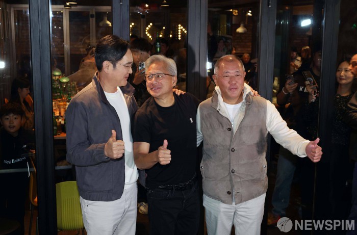 [서울=뉴스핌] 최지환 기자 = 이재용(왼쪽부터) 삼성전자 회장, 젠슨 황 엔비디아 최고경영자(CEO), 정의선 현대차그룹 회장이 30일 서울 강남구 삼성동의 한 치킨집에서 회동을 마친 뒤 기념촬영을 하고 있다. 2025.10.30 choipix16@newspim.com