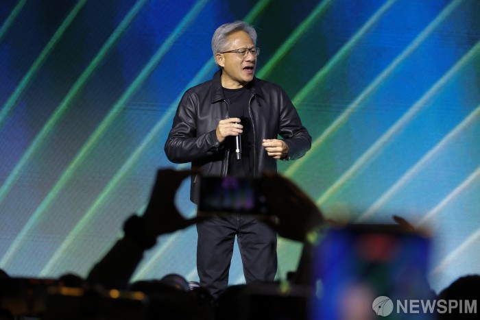 [서울=뉴스핌] 최지환 기자 = 젠슨 황 엔비디아 최고경영자가 30일 오후 서울 강남구 코엑스 K-POP 광장에서 열린 지포스 게이머 페스티벌에서 발언하고 있다. 2025.10.30 choipix16@newspim.com