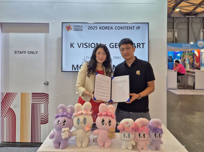 | [서울=뉴스핌] 최문선 기자 = CLE 2025 한국공동관에서 '케이비전'과 중국 현지 기업 'GENIO ART'가 MOU를 체결했다.(왼쪽부터 케이비전 이송미 차장, 'GENIO ART' 상해지사 Cui He 라이선싱팀장) [사진=콘진원] 2025.10.31 moonddo00@newspim.com |