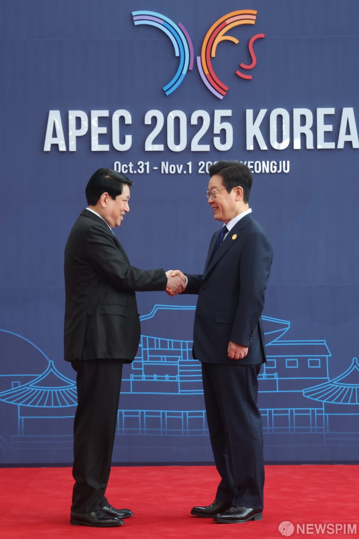 [서울=뉴스핌] 이재명 대통령이 31일 오전 경북 경주시 경주화백컨벤션센터(HICO)에서 열린 2025 아시아태평양경제협력체(APEC) 정상회의에 참석한 르엉 끄엉 베트남 국가주석을 맞이하고 있다. [사진=APEC 2025 KOREA & 연합뉴스] 2025.10.31 photo@newspim.com