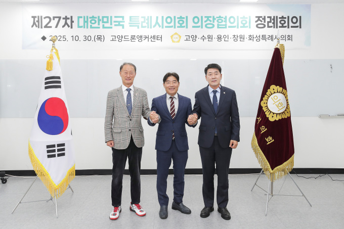 | 김운남 고양시의장(가운데)이 제27차 대한민국특례시의회 의장협의회에서 손을 맞잡고 있다. [사진=고양시의회] 2025.10.31 atbodo@newspim.com |