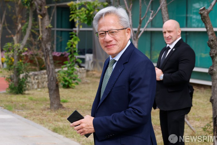 [포항=뉴스핌] 류기찬 기자 = 아시아태평양경제협력체(APEC) 정상회의에 참석하는 젠슨 황 엔비디아 최고경영자(CEO)가 31일 오후 경북 포항시 포항경주공항으로 입국해 환영객들에게 감사 인사를 하고 있다. 2025.10.31 ryuchan0925@newspim.com