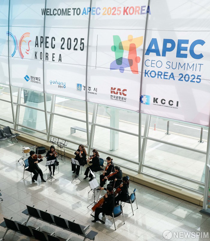 [포항=뉴스핌] 류기찬 기자 = 아시아태평양경제협력체(APEC) 정상회의 기간인 31일 오전 경북 포항시 포항경주공항에서 포항시립교향악단이 경제인들의 입국을 환영하는 연주를 하고 있다. 2025.10.31 ryuchan0925@newspim.com