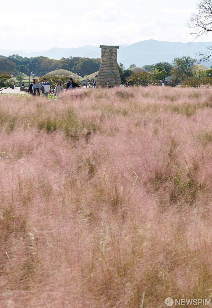 [경주=뉴스핌] 윤창빈 기자 = 완연한 가을 날씨를 보인 31일 경북 경주시 첨성대를 찾은 내외국인 관광객들이 핑크뮬리와 함께 나들이를 즐기고 있다. 2025.10.31 pangbin@newspim.com