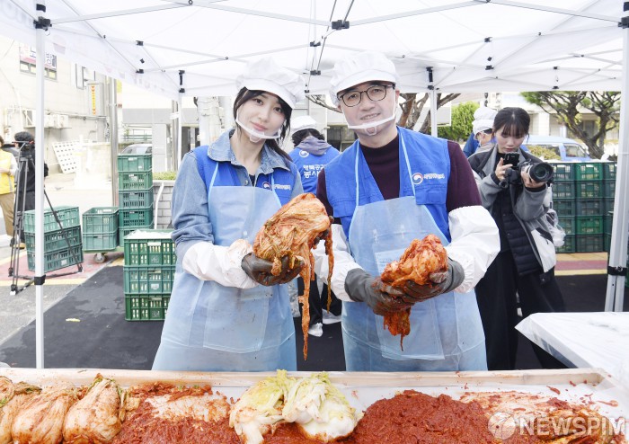 [서울=뉴스핌] 임기근 기획재정부 차관(오른쪽)과 박하선 행복공감봉사단장이 31일 서울 강서구 강서노인종합복지관에서 열린 '제18기 행복공감봉사단 5차 봉사활동'에서 김장 김치를 들고 포즈를 취하고 있다. [사진=기획재정부] 2025.10.31 photo@newspim.com