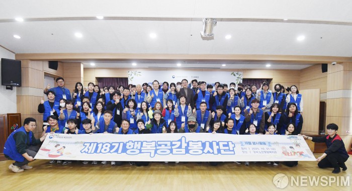 [서울=뉴스핌] 임기근 기획재정부 차관과 박하선 행복공감봉사단장을 비롯한 봉사자들이 31일 서울 강서구 강서노인종합복지관에서 열린 '제18기 행복공감봉사단 5차 봉사활동'에서 기념촬영을 하고 있다. [사진=기획재정부] 2025.10.31 photo@newspim.com