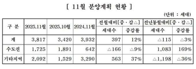 31일 대한주택건설협회가 회원사를 대상으로 11월 주택분양 계획을 집계한 결과에 따르면 14개사가 14개 사업장에서 총 3817가구를 공급한다.