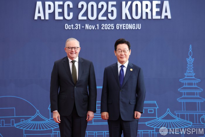 [서울=뉴스핌] 이재명 대통령이 31일 오전 경북 경주시 경주화백컨벤션센터(HICO)에서 열린 2025 아시아태평양경제협력체(APEC) 정상회의에 참석한 앤서니 앨버니지 호주 총리와 기념 사진을 촬영하고 있다. [사진=APEC 2025 KOREA & 연합뉴스] 2025.10.31 photo@newspim.com