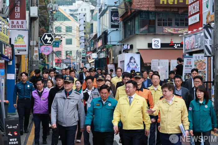 [서울=뉴스핌] 김학선 기자 = 핼러윈 데이인 31일 윤호중 행정안전부 장관이 인파 밀집 관리 대상 지역인 서울 마포구 홍대 관광특구 거리를 점검하고 있다. 2025.10.31 yooksa@newspim.com