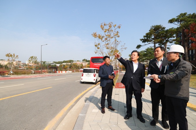 | 의왕 초평지구 송부로 연결도로 임시 개통. 김성제 시장이 송부로 연결도로 임시 개통 현장을 찾아 한국토지주택공사관계자로 부터 브리핑을 청취하고 도로 현장을 점검하고있다. [사진=의왕시] |