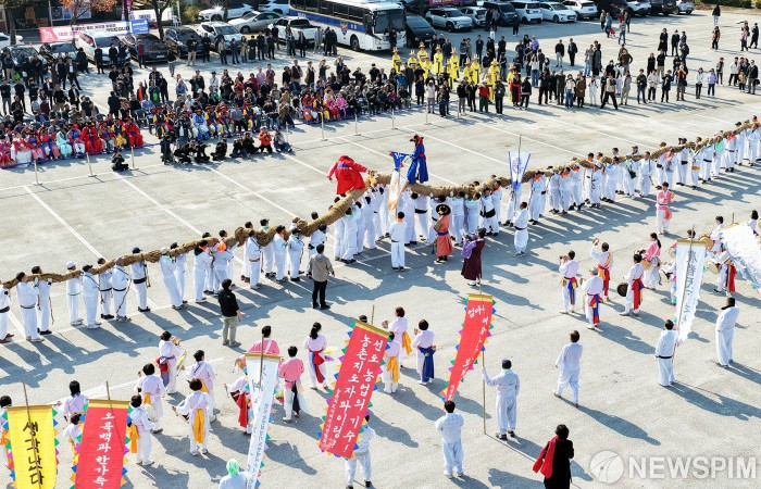 [서울=뉴스핌] 양윤모 기자 = 31일 오후 ‘2025 여주오곡나루축제’ 여는마당에서 쌍용거줄다리기 행사가 펼쳐지고 있다. ‘여주오곡나루축제’는 무대·개막 의전·초대가수가 없는 ‘3무(無) 축제’라는 독창적인 운영 철학으로 주목받아 왔다. 특히 올해 축제는 ‘여주의 전통과 풍요를 세계와 함께 나누는 축제’를 주제로, 기존의 대표 프로그램에 글로벌 교류와 디지털 감성을 더한 콘텐츠가 대폭 확대되어 여주시 남한강변 신륵사 관광지 일원에서 내달 2일까지 열린다. [사진=여주시청] 2025.10.31 yym58@newspim.com