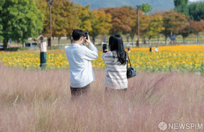 | 지난달 31일 경북 경주시 첨성대를 찾은 내외국인 관광객들이 핑크뮬리와 함께 나들이를 즐기고 있는 모습. 사진은 기사와 무관. [사진=뉴스핌DB] |