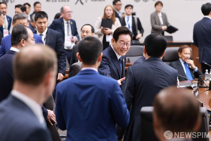 [서울=뉴스핌] 이재명 대통령이 1일 경주화백컨벤션센터(HICO)에서 열린 2025 아시아태평양경제협력체(APEC) 정상회의 제2세션에 입장해 각국 정상들과 인사하고 있다. [사진=APEC 2025 KOREA & 연합뉴스] 2025.11.01 photo@newspim.com