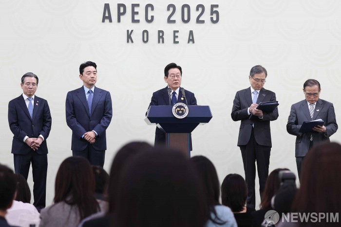 이 대통령은 이날 오후 경주 국제미디어센터(IMC)에서 기자회견 모두발언을 통해 "(회원국들이) 구조적 요인으로 인해 아시아·태평양 지역이 다양한 도전에 직면해 있으며 지속적 번영과 성장을 위해 상호 간 무역 확대가 필요하다는 인식을 함께 했다"고 밝혔다.