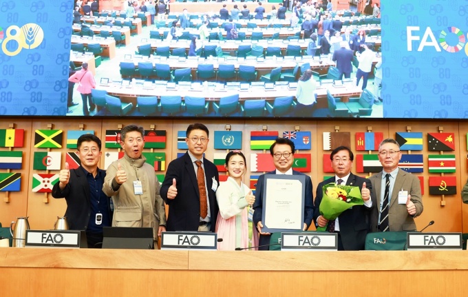 | 지난달 31일(현지시간) 이탈리아 로마 FAO 본부에서 열린 'FAO 세계중요농업유산' 등재 인증서 수여식.[사진=울진군]2025.11.03 nulcheon@newspim.com |