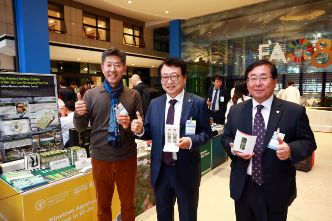 손병복 울진군수와 김정희 울진군의장, 산림과 직원 등 울진군 대표단은 지난달 31일(현지 시간) 이탈리아 로마 FAO 본부에서 열린 인증서 수여식에서 공식 인증서를 전달받았다.