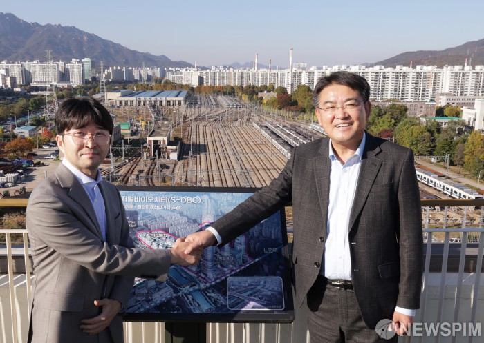 [서울=뉴스핌] 양윤모 기자 = 오승록 노원구청장이 3일 오후 조성진 큐어버스 대표와 서울 노원구 ‘서울 디지털바이오시티(S-DBC)’ 사업 예정지를 직접 둘러본후 기념촬영을 하고 있다. 큐어버스는 혁신적인 저분자 화합물 신약을 발굴하는 글로벌 바이오텍 기업으로, 뇌·신경 질환, 암, 섬유화 등 난치성 질환 치료제 개발을 추진하고 있다. 또한 글로벌 공동 연구 및 기술 이전에도 적극 나서며, 다양한 사업 모델을 통해 파트너십을 확대하고 있다. [사진=노원구청] 2025.11.04 yym58@newspim.com